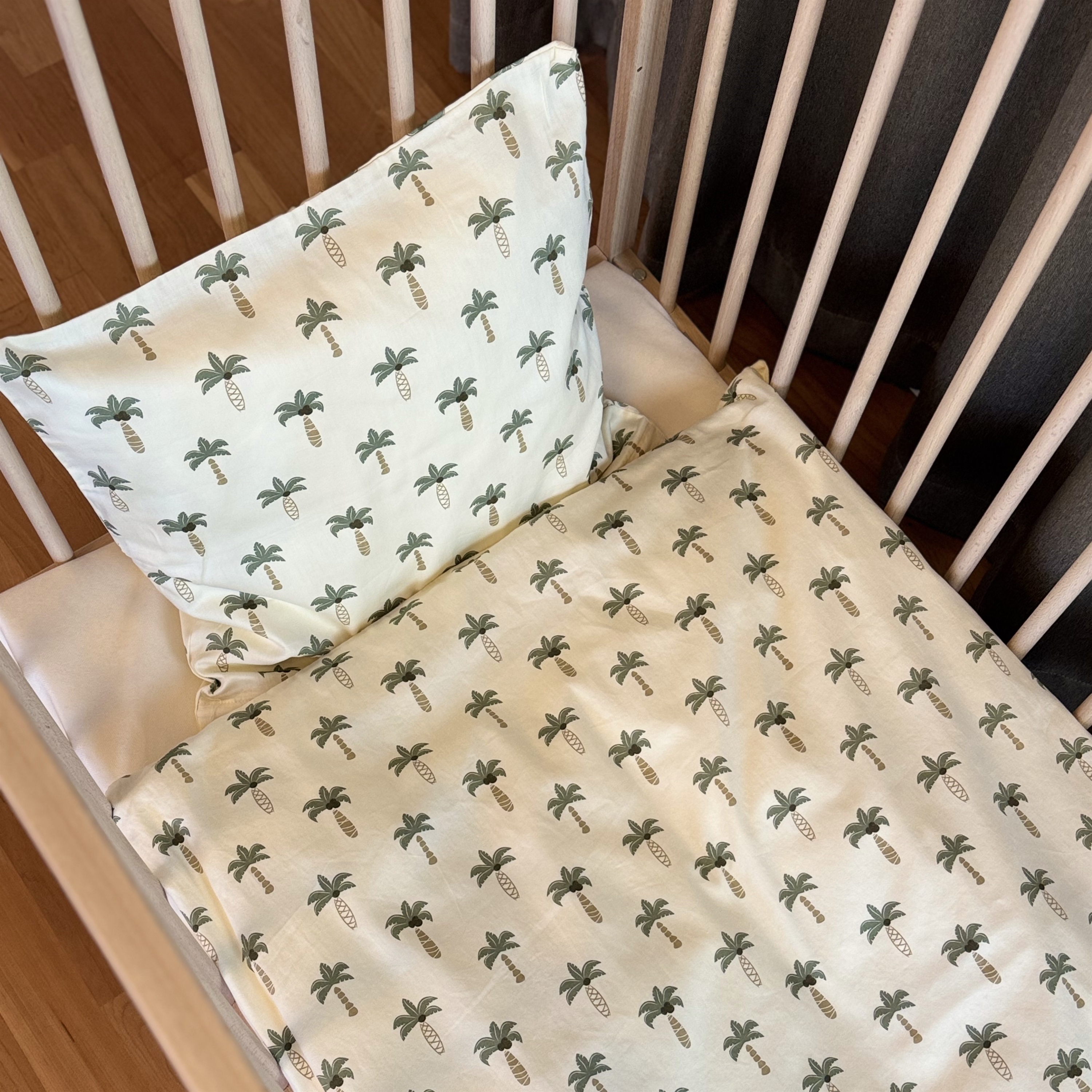 Baby sengetøj 70x100 - bomuldssatin - Palme - Luna Denmarkpalme sengetøj til baby i redt sengRedt seng i soveværelse med sengetøj i print med palmerDetalje af pudebetræk med palmer