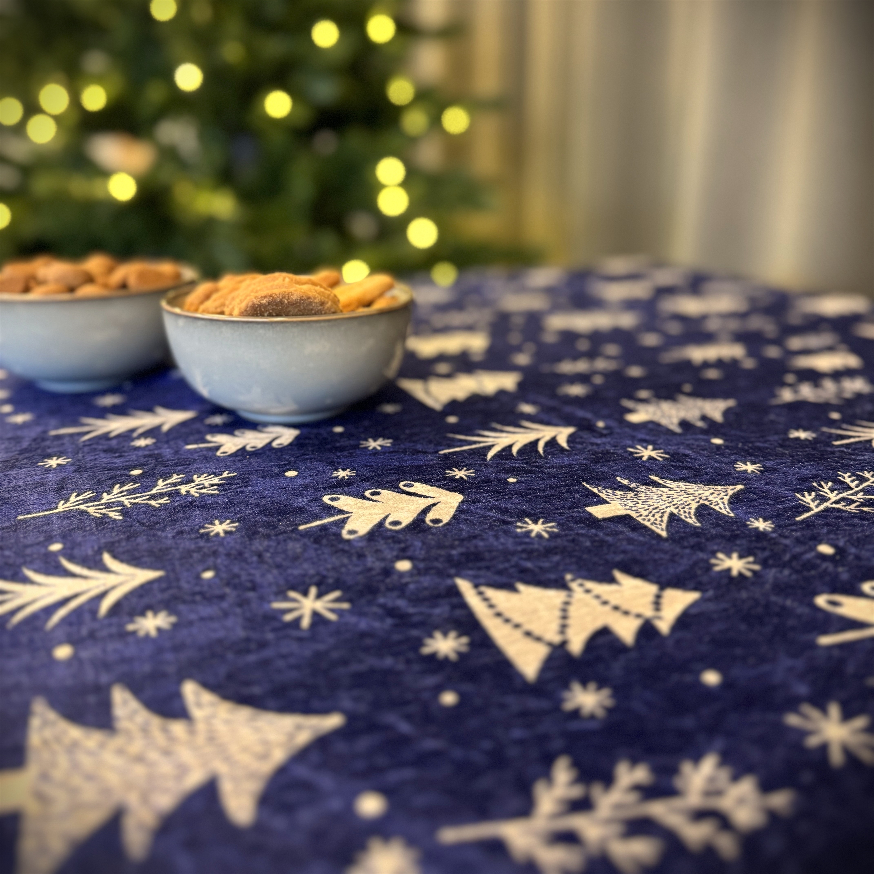 Juledug - Nervøs velour 150x300 cm - Juletræ og stjerne - Blå