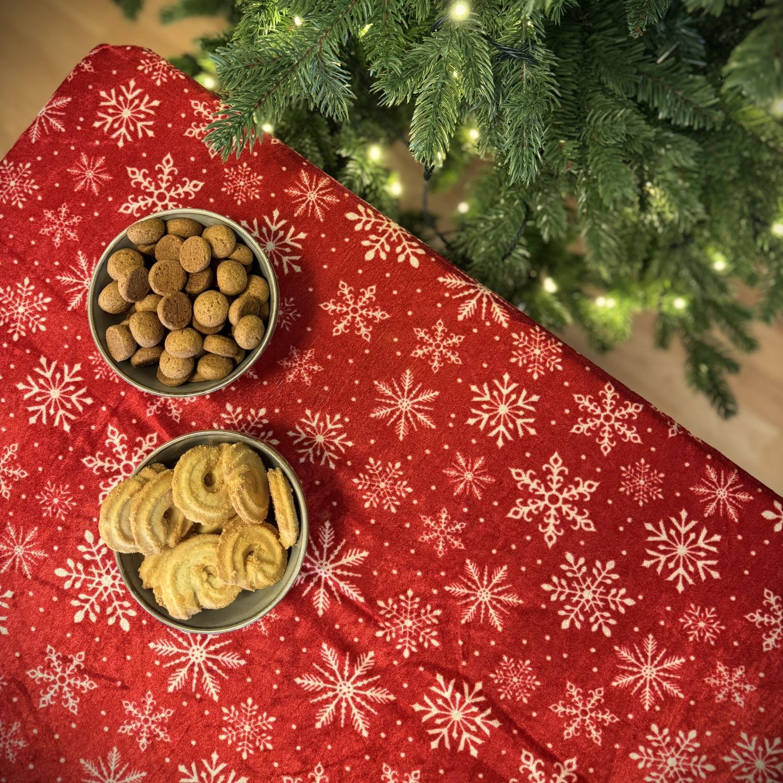 Juledug - Nervøs velour 150x300 cm - Rød med snefnugjuledug på dækket bord