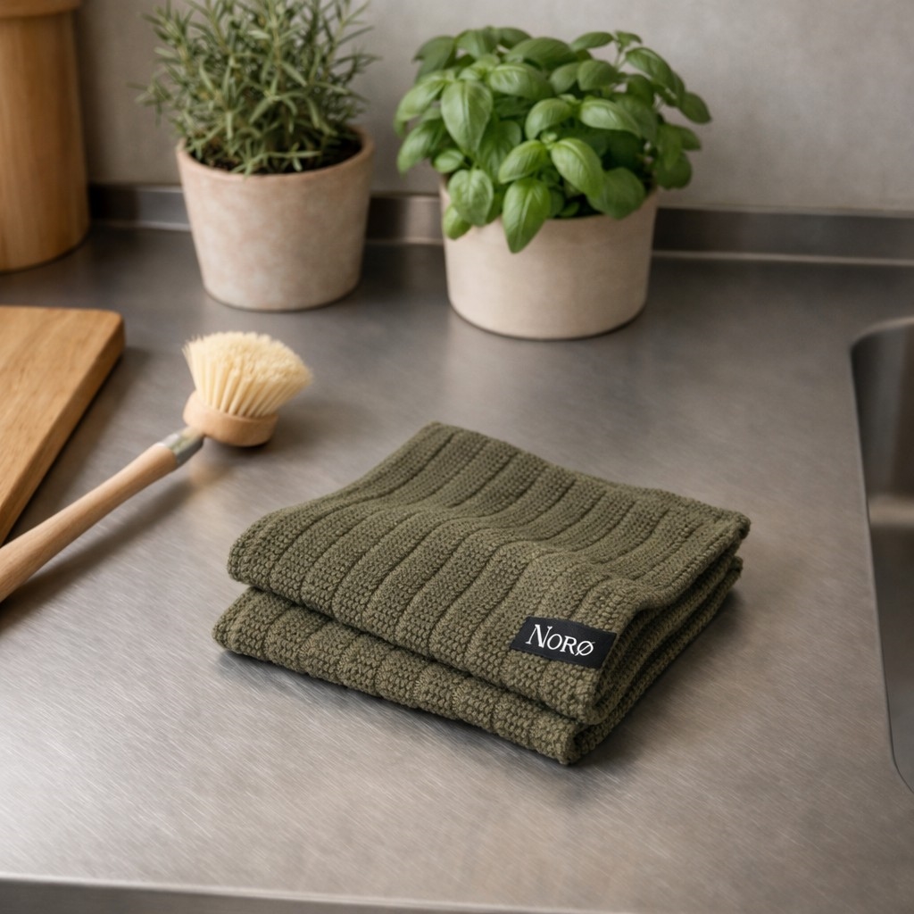 Karklude - oliven - 2 stk. - NorøNorø karklude ved vask Oliven grønNorø karklude og viskestykker på køkkenbordNorø karklud olivengrøn