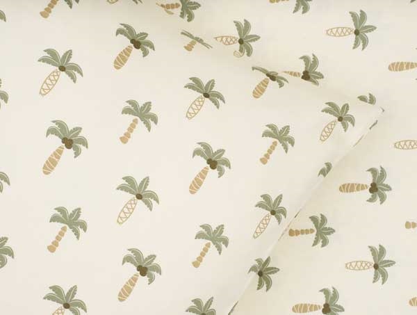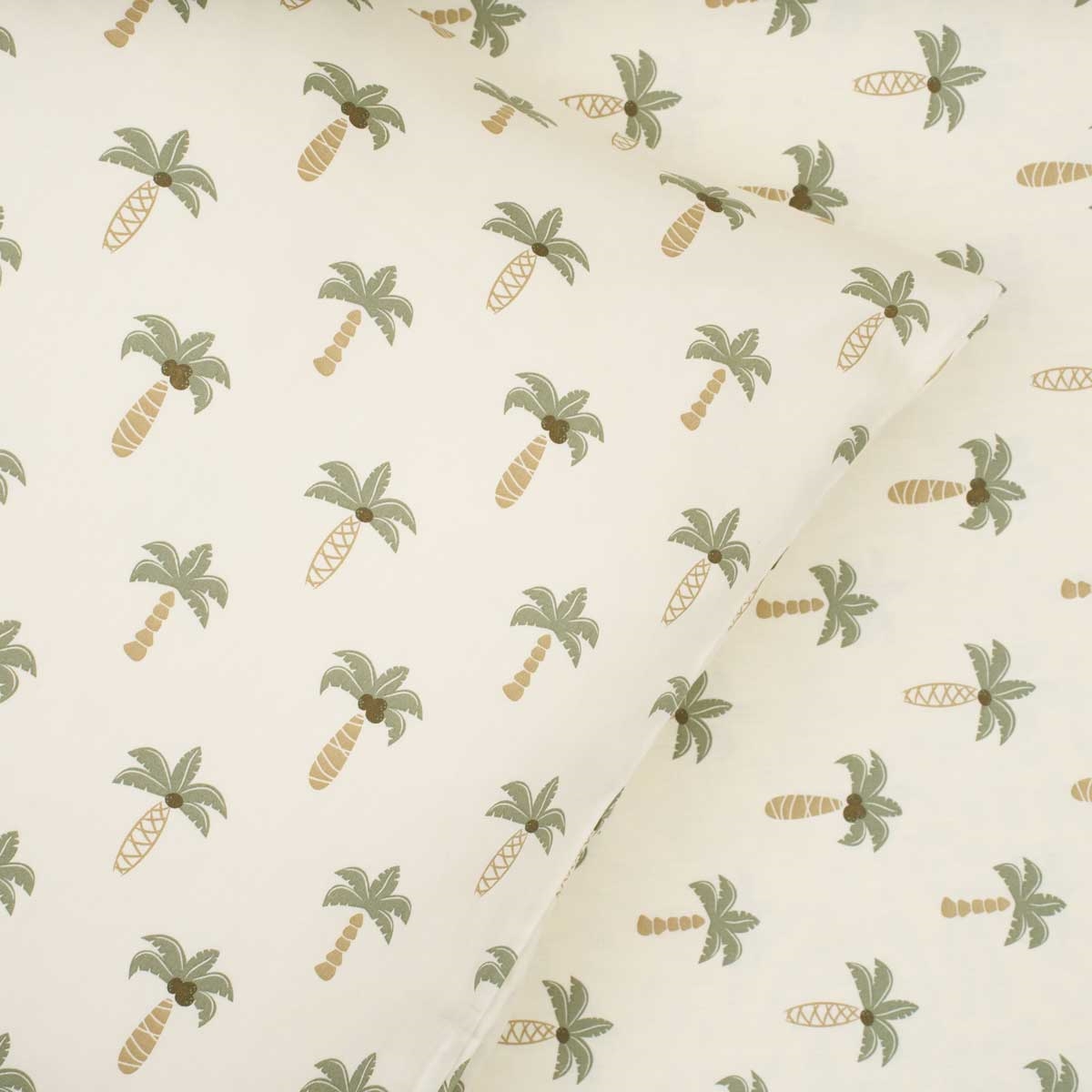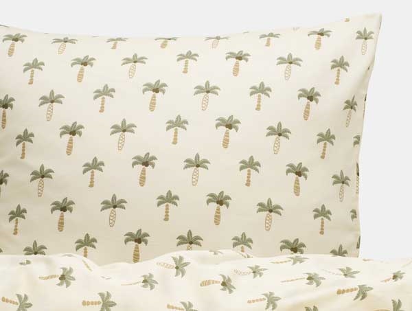 Sengesæt 140x200 cm - bomuldssatin - Palme - Luna DenmarkSoveværelse med redt seng med palmerDetalje af pudebetræk med palmer