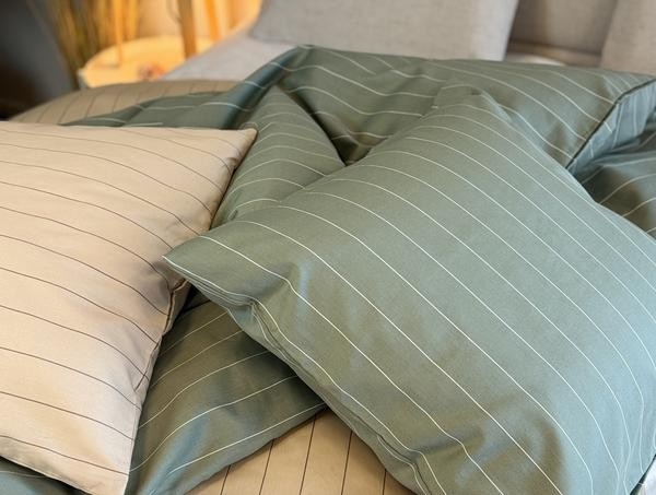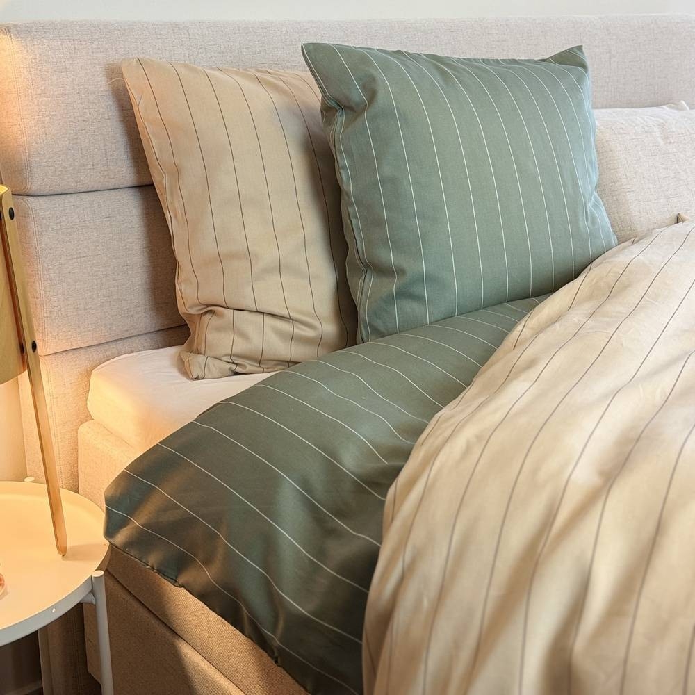 Sengetøj 140x220 cm - bomuldssatin - Sandvig - Grøn - Luna Denmarksandvig sengetøj grøn og ivory på sengsandvig sengetøj grøn på redt seng 140x220sandvig sengetøj grøn closeup 140x220