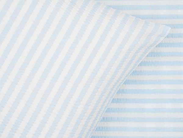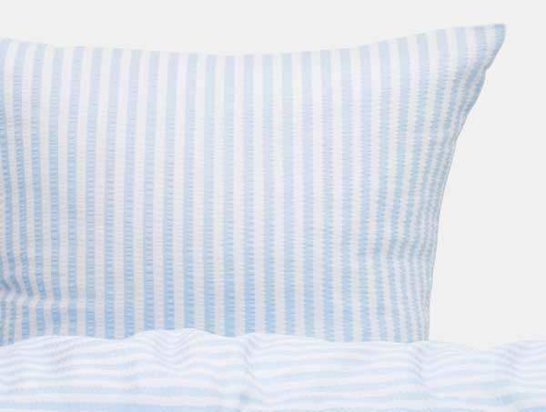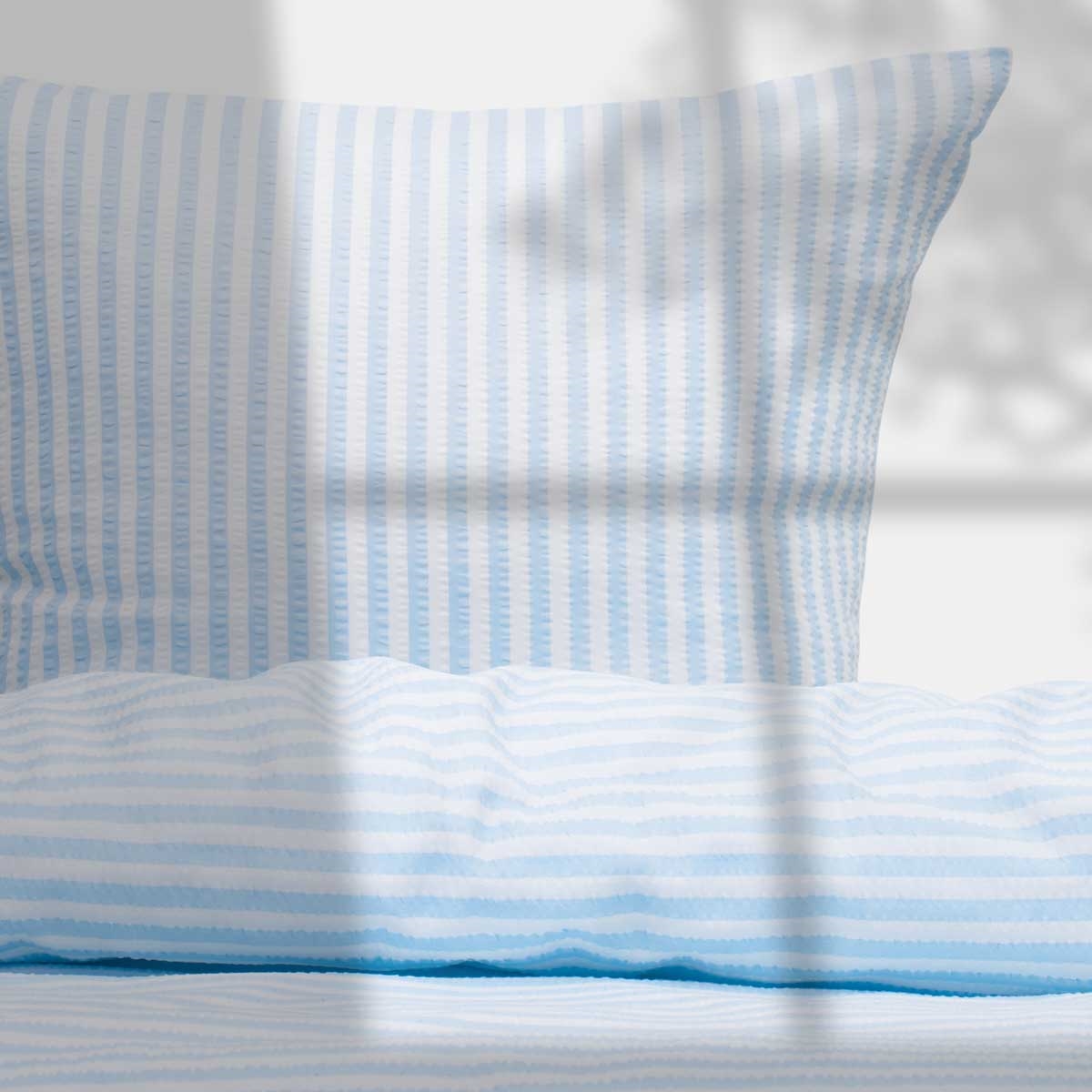 Sengetøj 140x220 cm - bæk og bølge - Stripe - Lys blå - Luna DenmarkSoveværelse redt seng med bæk og bølge lyseblå striberdetalje bæk og bølge lyseblå striber pudebetræk